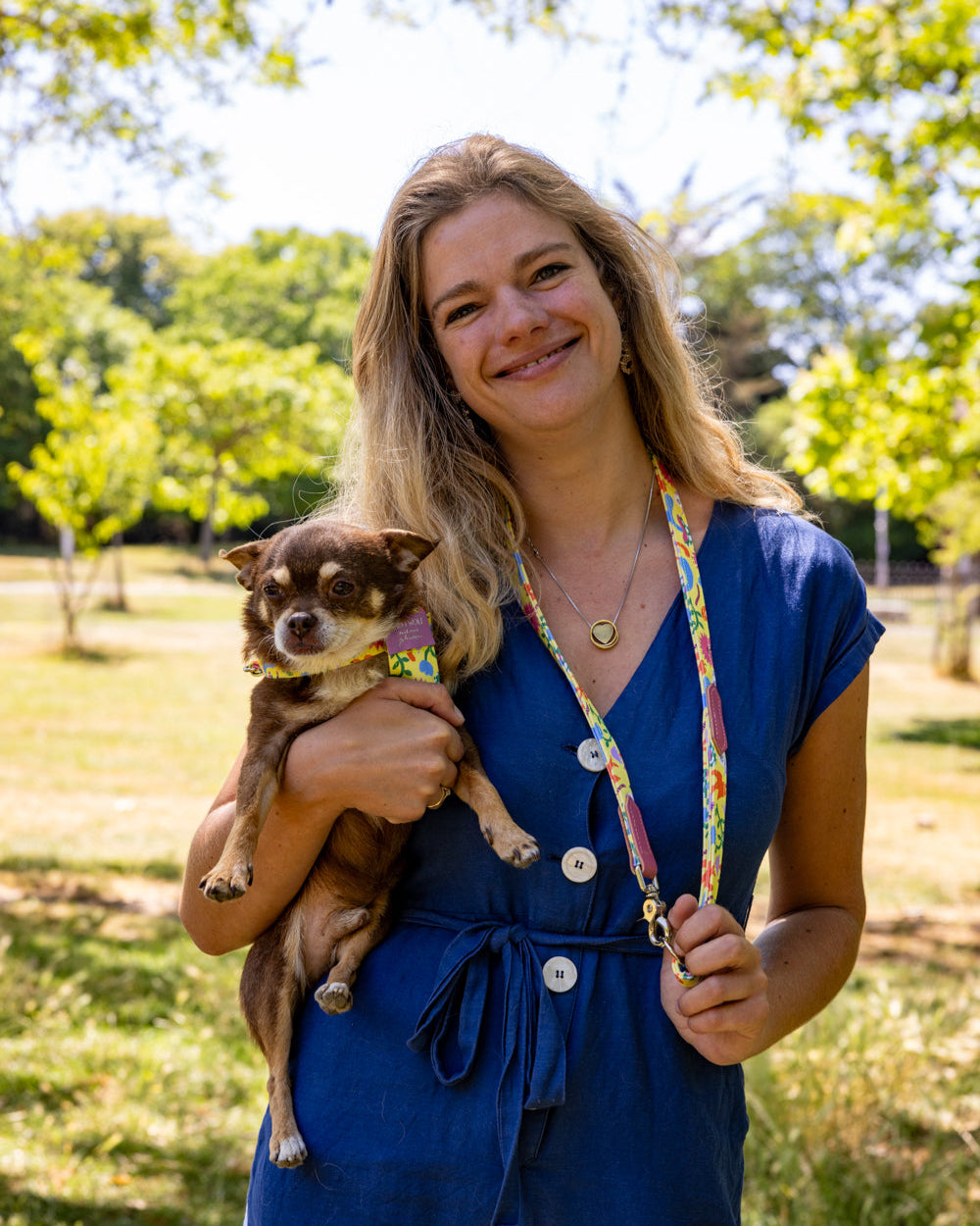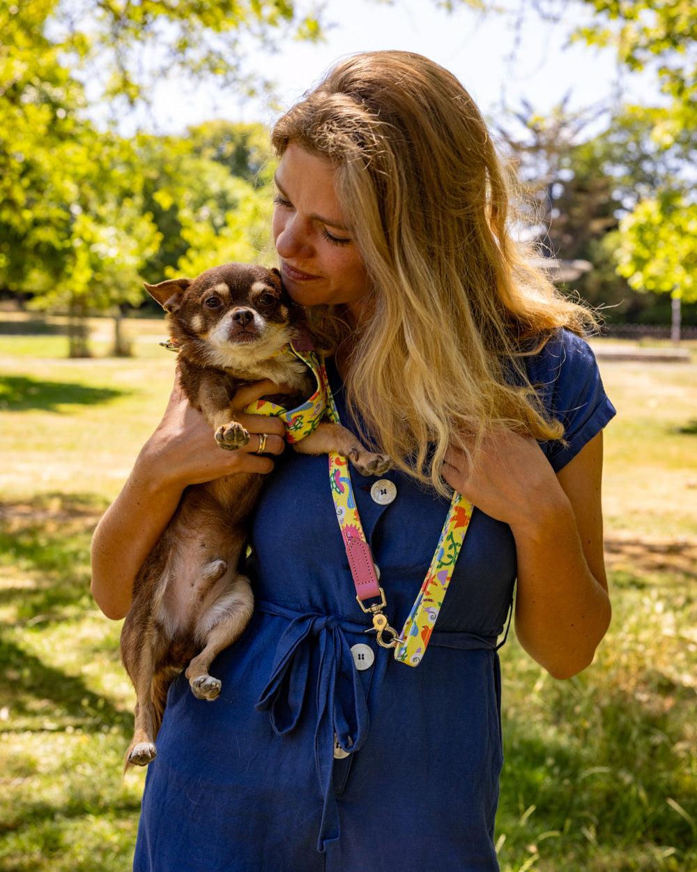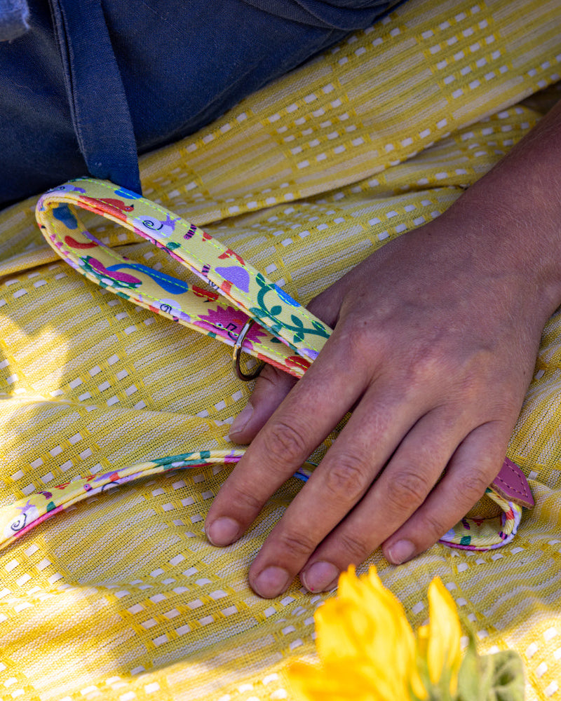 ABOUT THE PRINT: Part of our collaboration with local illustrator Mélanie Johnsson, this whimsical print features vibrant flora and fauna. Celebrating the joys of the natural world, dancing flowers, enchanting mushrooms, wriggly worms and a smiling sunshine adorn this cheerful print. Perfect for sun-loving hounds and their humans.