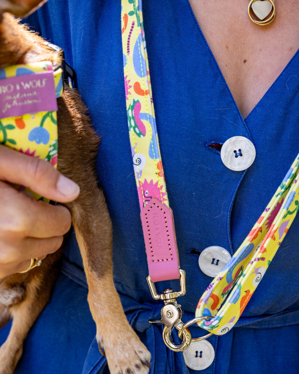 Your dog will go mutts for Hiro + Wolf’s fashionable handmade dog lead. Built to last with solid hardware, reinforced stitching, and durable webbing. This strong dog lead is ideal for puppies, small to large dogs, dogs who pull, and trendsetter dogs with style. Featuring funky mushroom motifs, this classic lead is a must-have for fun-loving hounds and their humans. Crafted in the UK by passionate pet-lovers, take a walk in the park with your pup feeling safe and chic with our handmade classic dog lead.