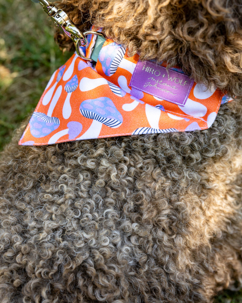 ABOUT THE PRINT: Designed by local illustrator Mélanie Johnsson, this enchanting print features a bold orange background, adorned with whimsical mushrooms. Inspired by the magic of the outdoors, this print is sure to delight human and hound alike. Perfect for every fun-guy out there!