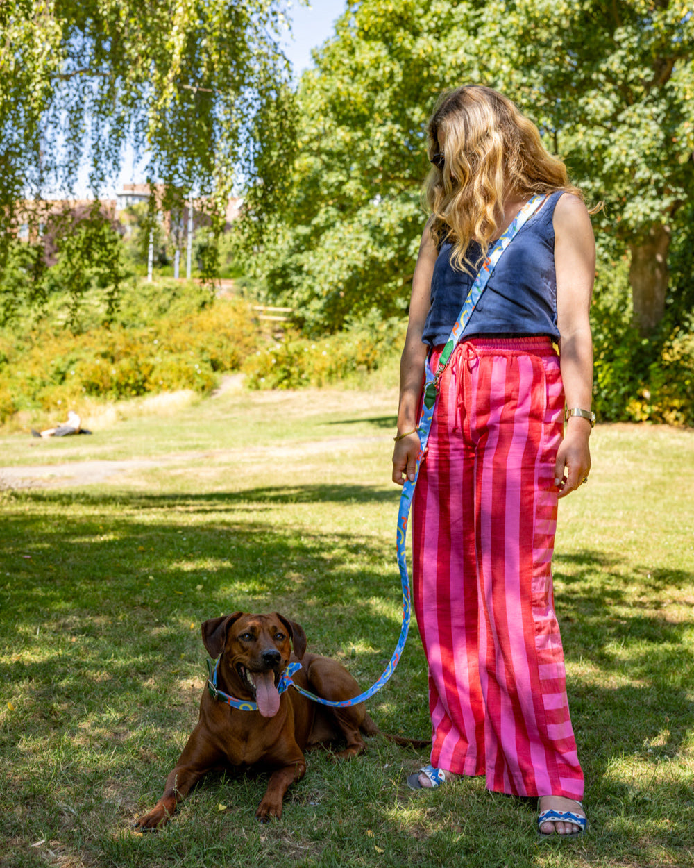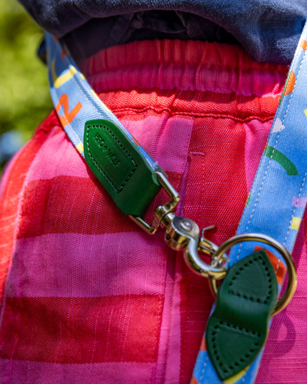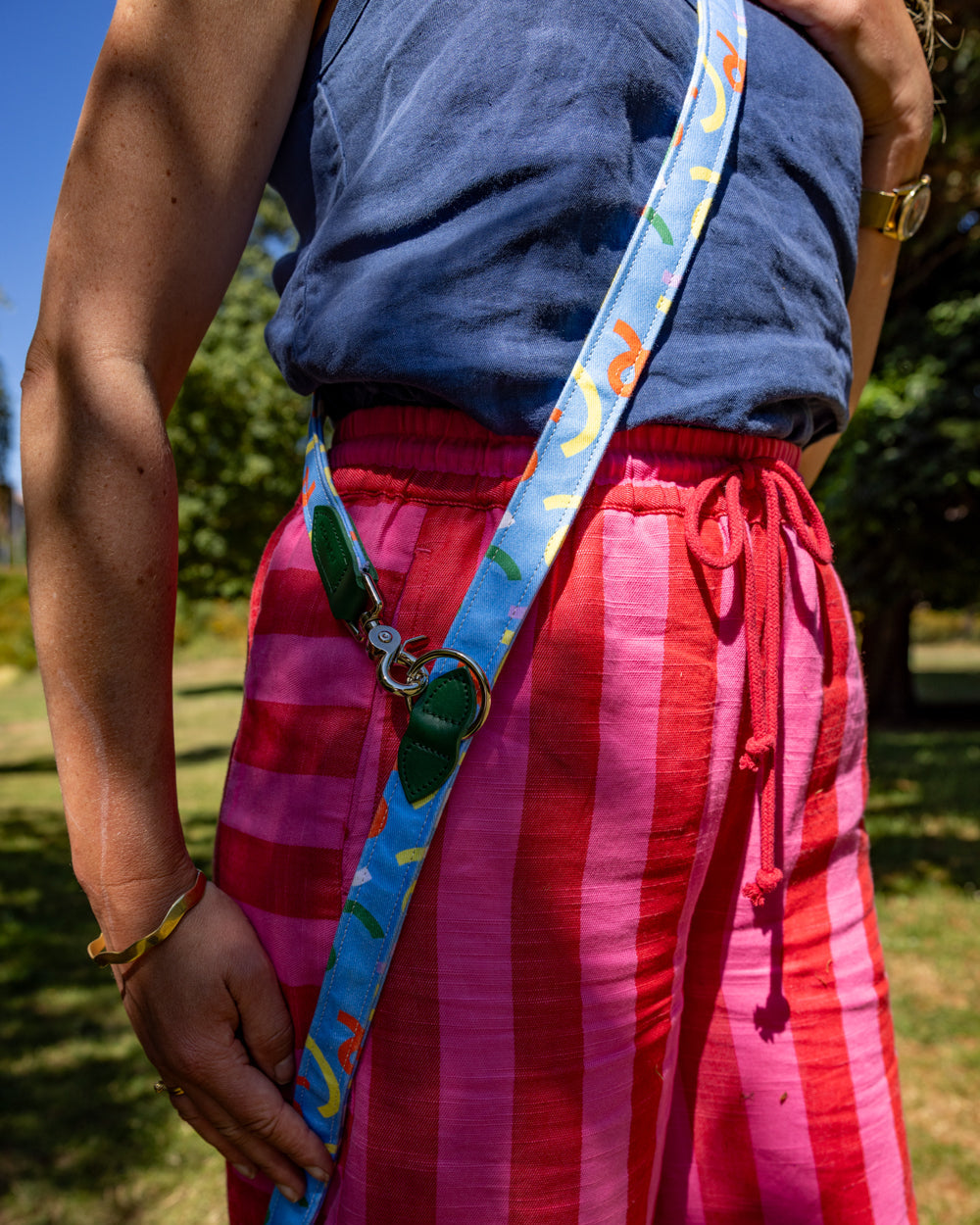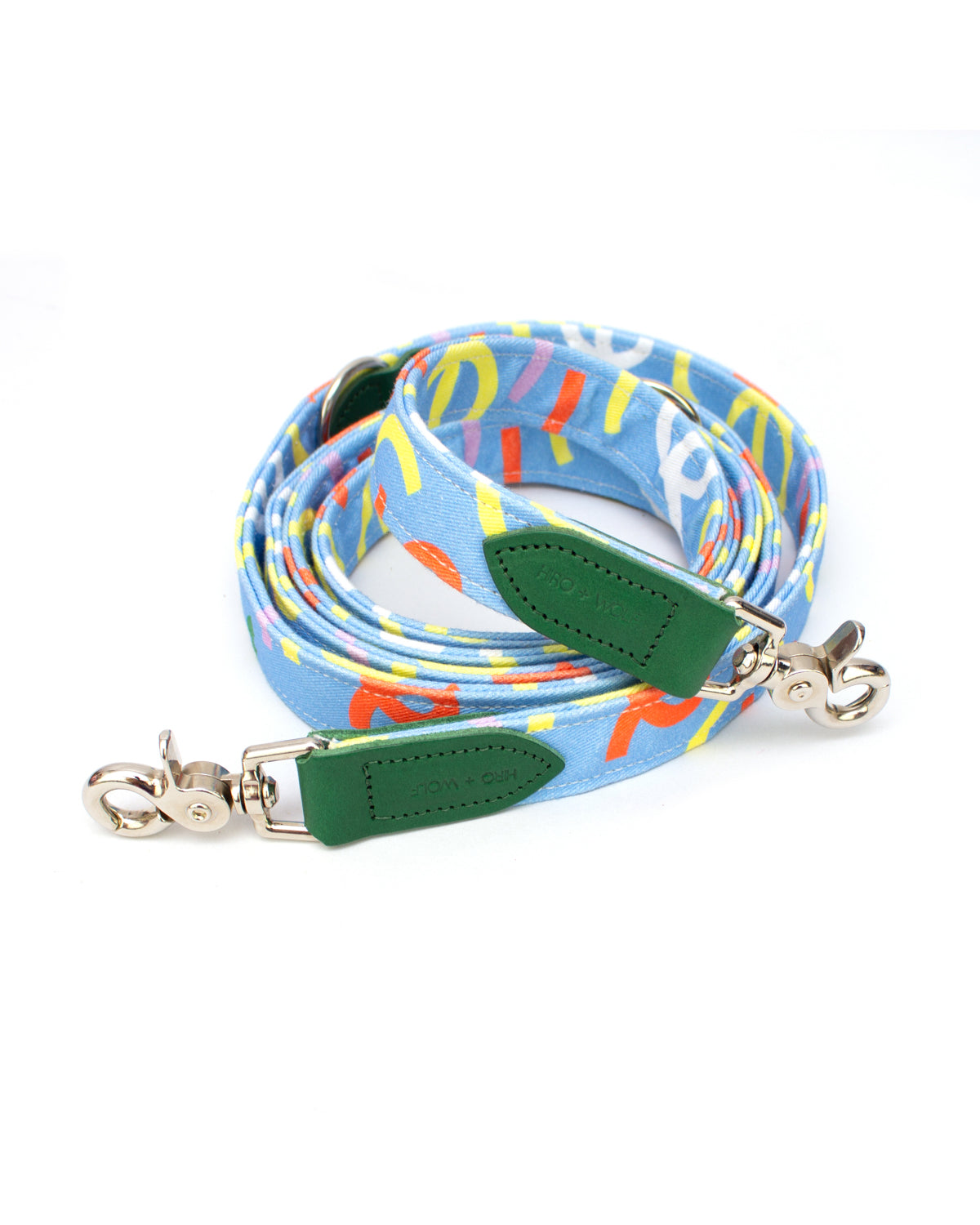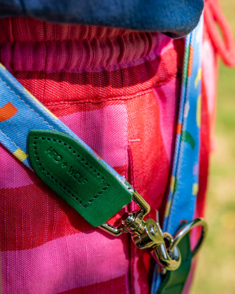 Multifunctional hands-free dog lead for hiking, jogging, training, and controlled distance walking. Our clever coupler lead for dogs features adjustable lengths, and can be worn around your waist, shoulder, or easily tethered. Enjoy a safer and easier experience with your dog using our carefully designed hands-free dog lead. The fabric, webbing, and hardware are the ideal strength for pully dogs, large dogs, and small dogs alike. Handmade in the UK in our colourful Hiro + Wolf x Melanie Johnsson print.