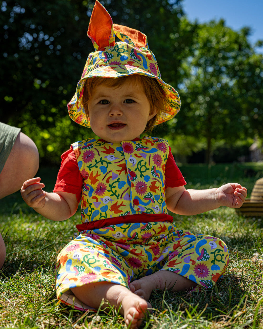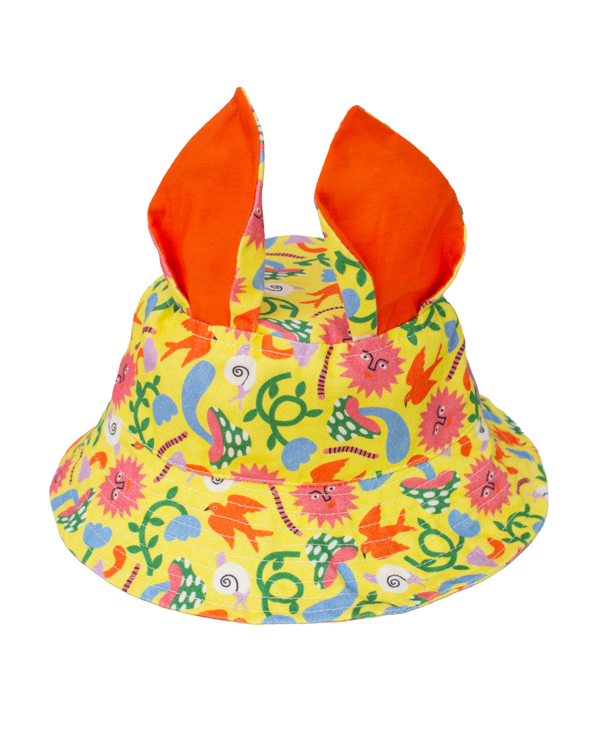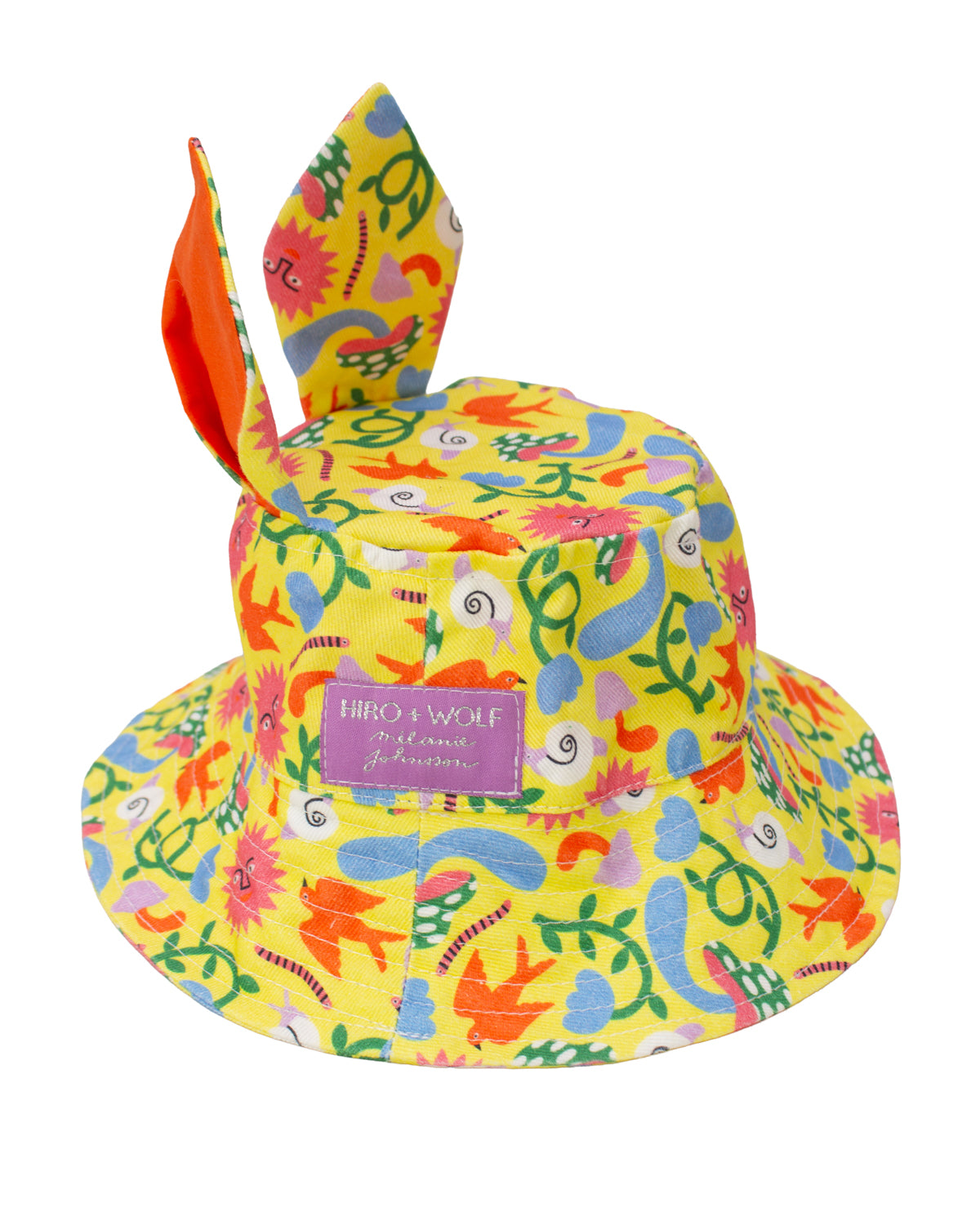 Let imagination bloom with this vibrant bucket hat for kids, handmade in the UK from soft organic cotton. Crafted in an exclusive Hiro + Wolf x Mélanie Johnsson fabric, this hat features a joyful mix of colourful animals, flowers, and playful shapes that turn every outing into a celebration.