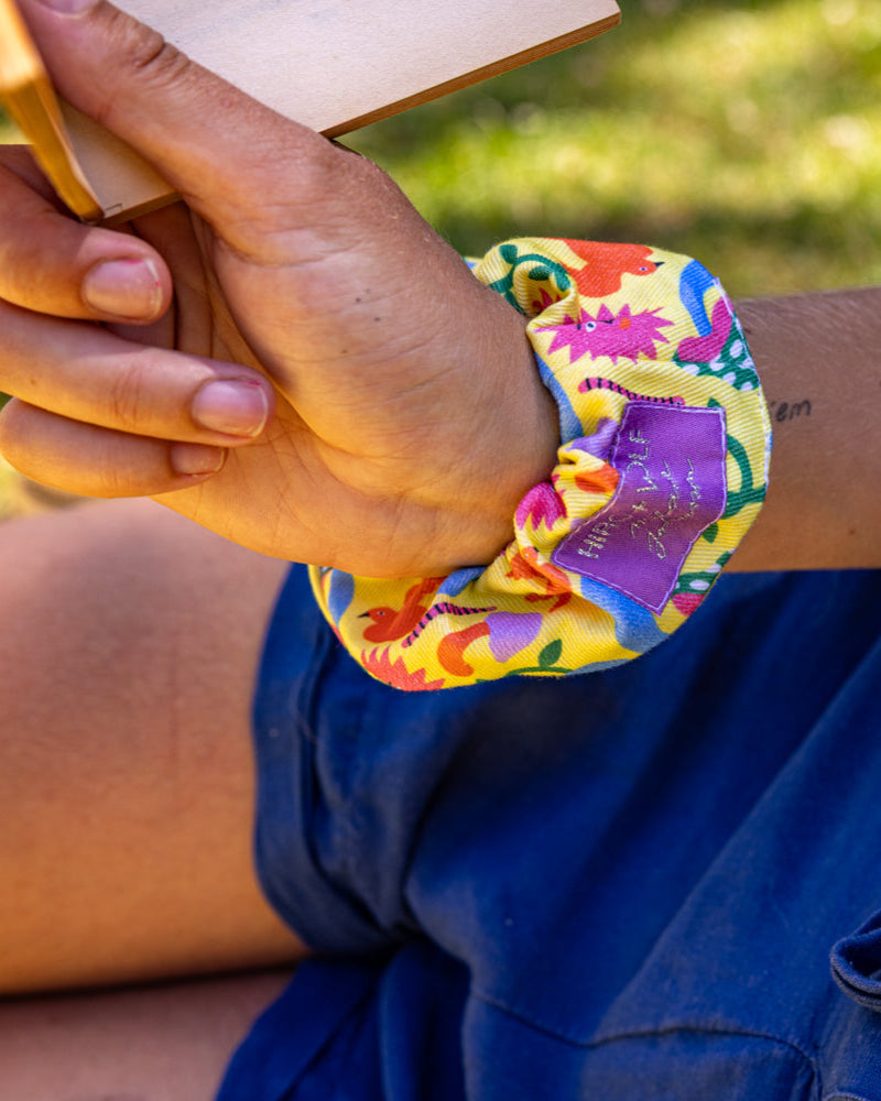 Add a dash of whimsey to your hair routine with our Psychedelic Garden Organic Cotton Scrunchie! Designed by local illustrator Mélanie Johnsson, this playful scrunchie features vibrant flora and fauna on a sunny yellow background. Crafted from super-soft, sustainably sourced organic cotton, it’s gentle on hair and kind to the planet.