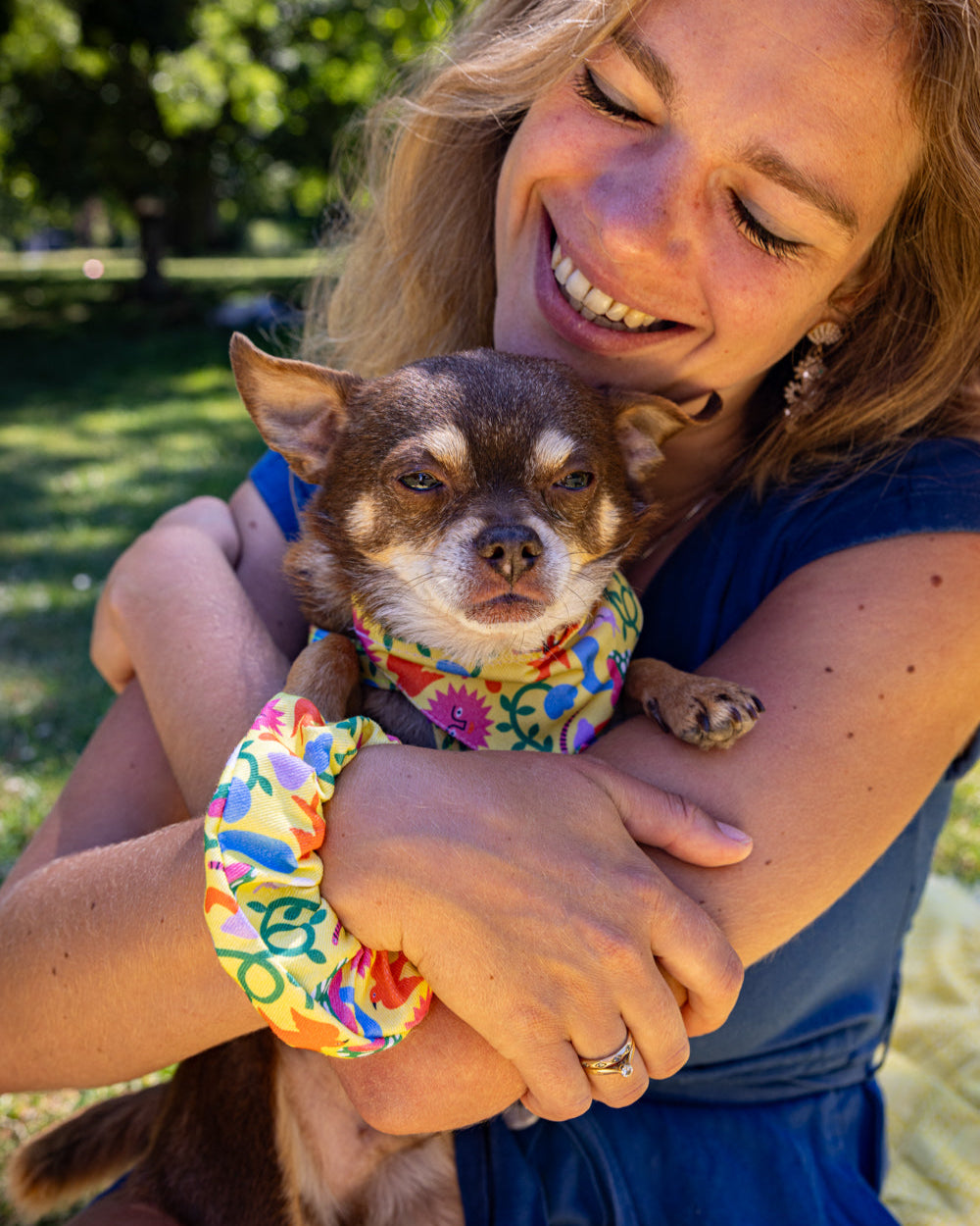 Celebrating the joys of the natural world, dancing flowers, enchanting mushrooms, wriggly worms and a smiling sunshine adorn this cheerful print. Whether you’re heading out for woodland walks or lounging at home with your four-legged friend, delight in a joyful accessory that’s as magical as it is practical!