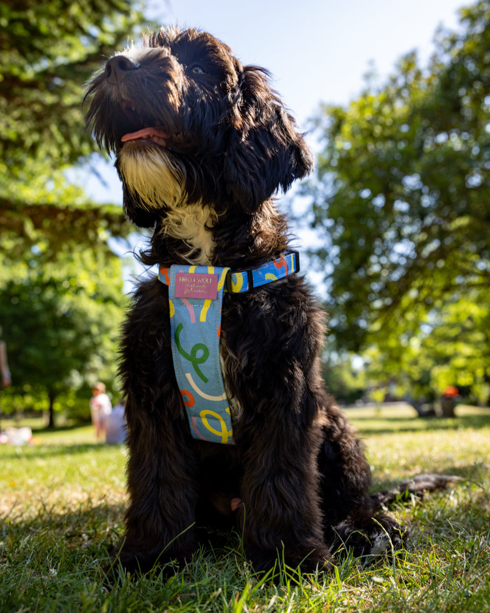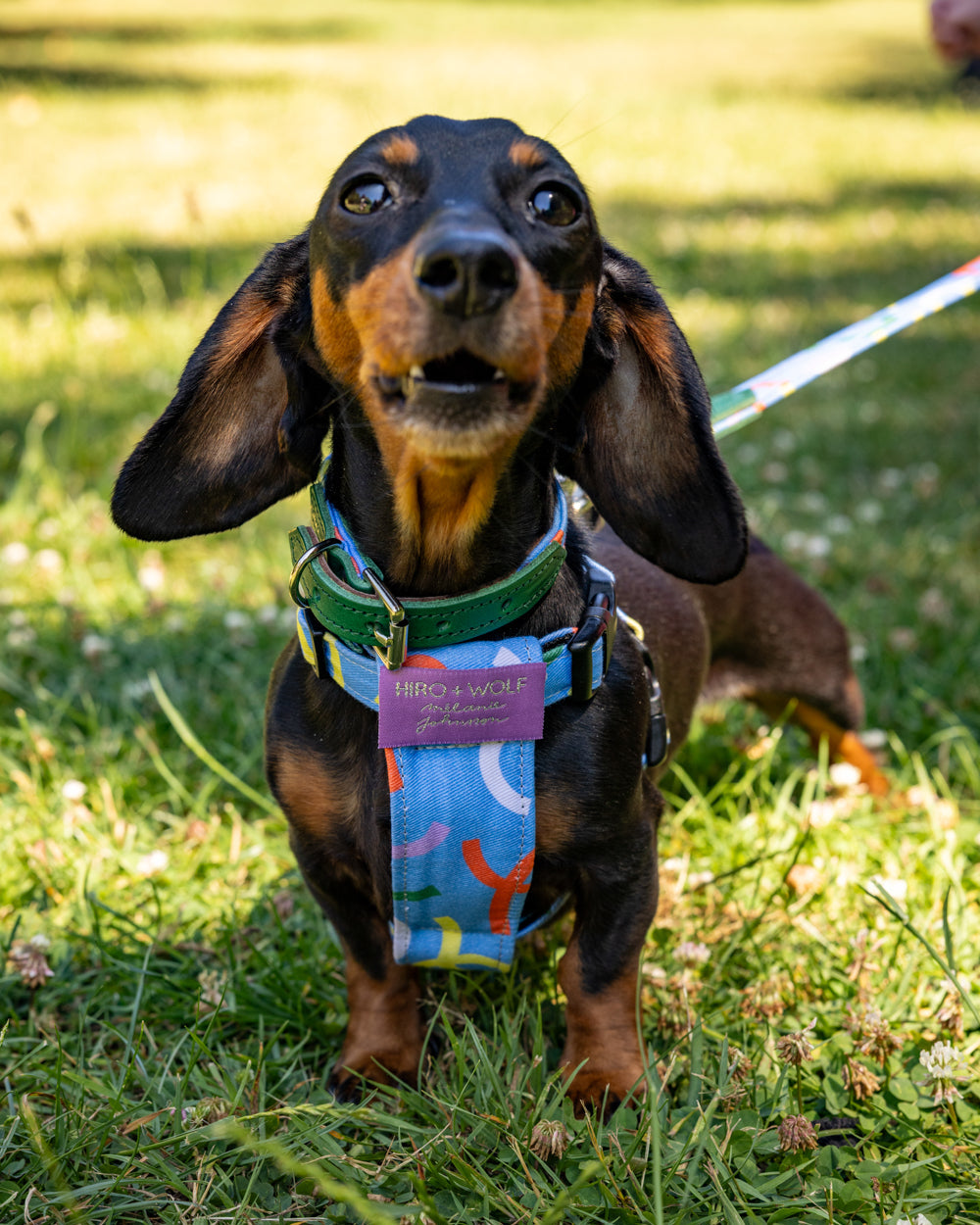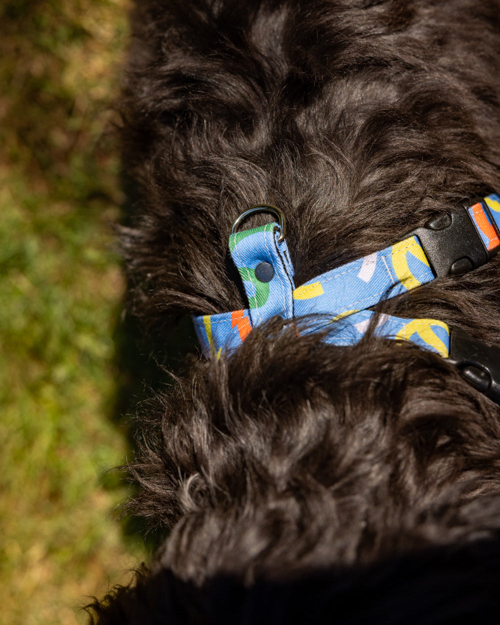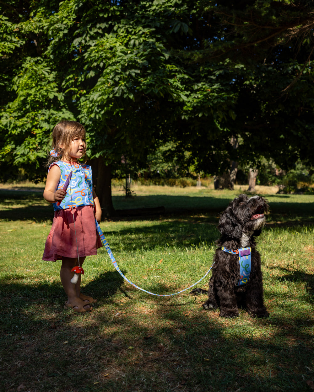 ABOUT THE PRINT: Inspired by the magical dance of falling leaves, this colourful print is perfect for playful puppies and kids alike. Part of our collaboration with local illustrator Mélanie Johnsson, this design features abstract wiggly lines in cheerful shades of lilac, yellow, green, orange and white against a bold blue background.