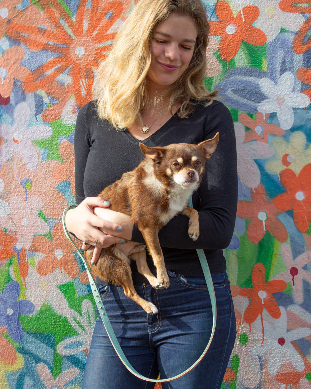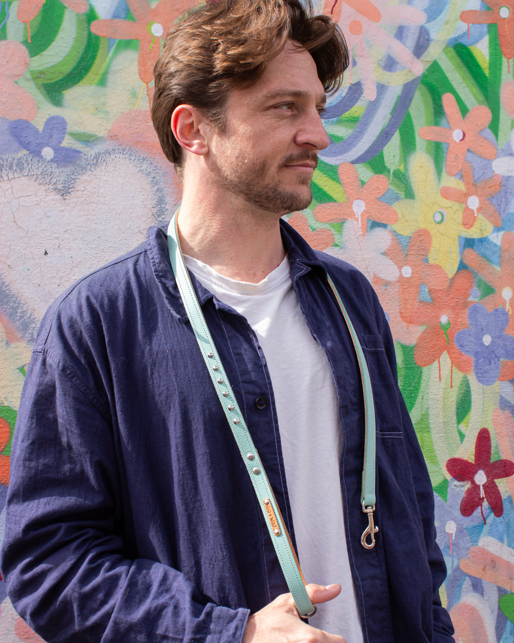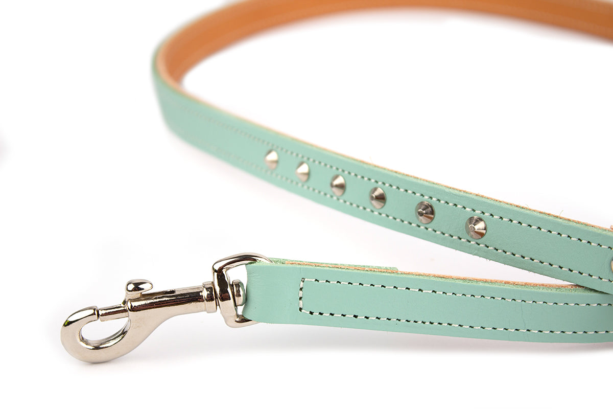 Choose from two colourways; pretty pastel Mint + Tan or bright, bold Yellow + Green. The leather dog leads perfectly complement our range of leather dog collars, and can also be coordinated with our organic cotton dog collars.