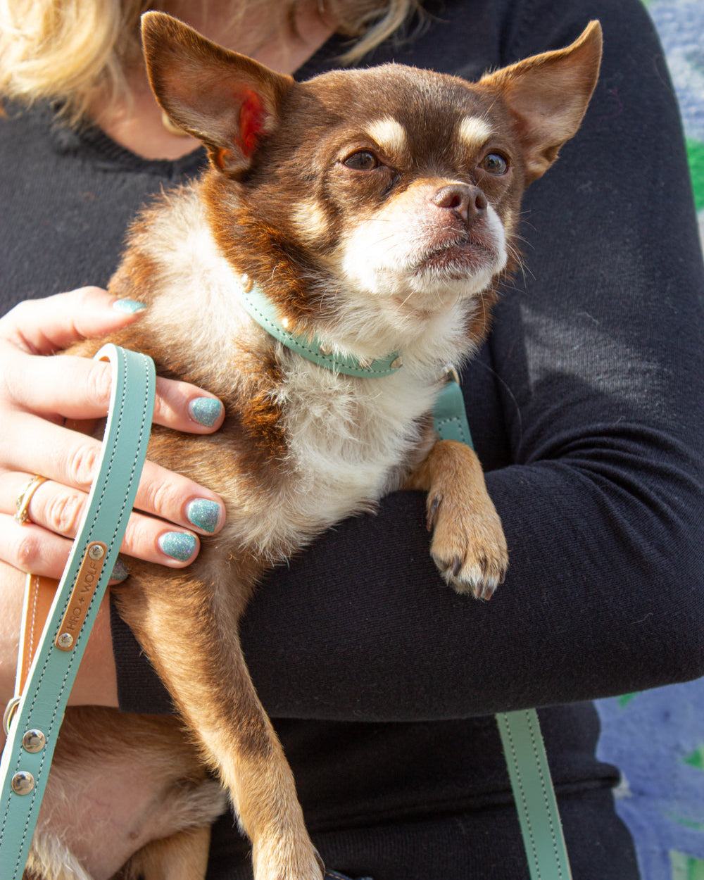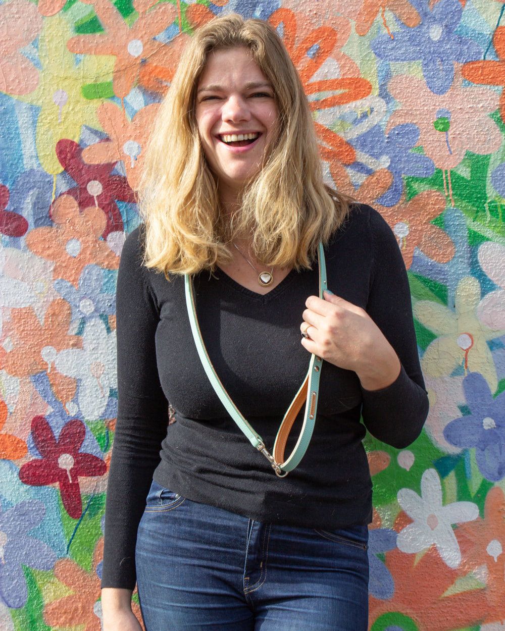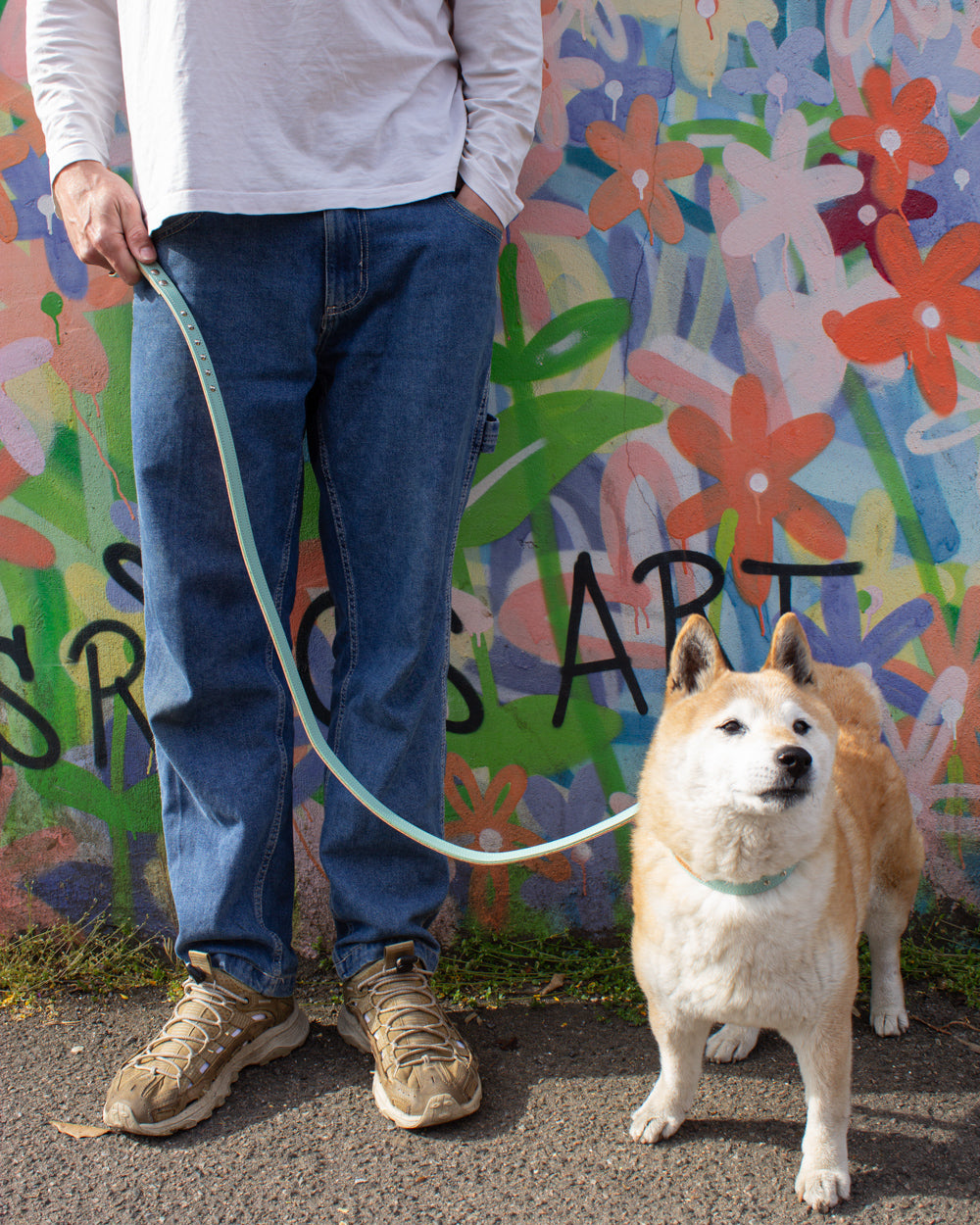 Choose from two colourways; pretty pastel Mint + Tan or bright, bold Yellow + Green. The leather dog leads perfectly complement our range of leather dog collars, and can also be coordinated with our organic cotton dog collars.