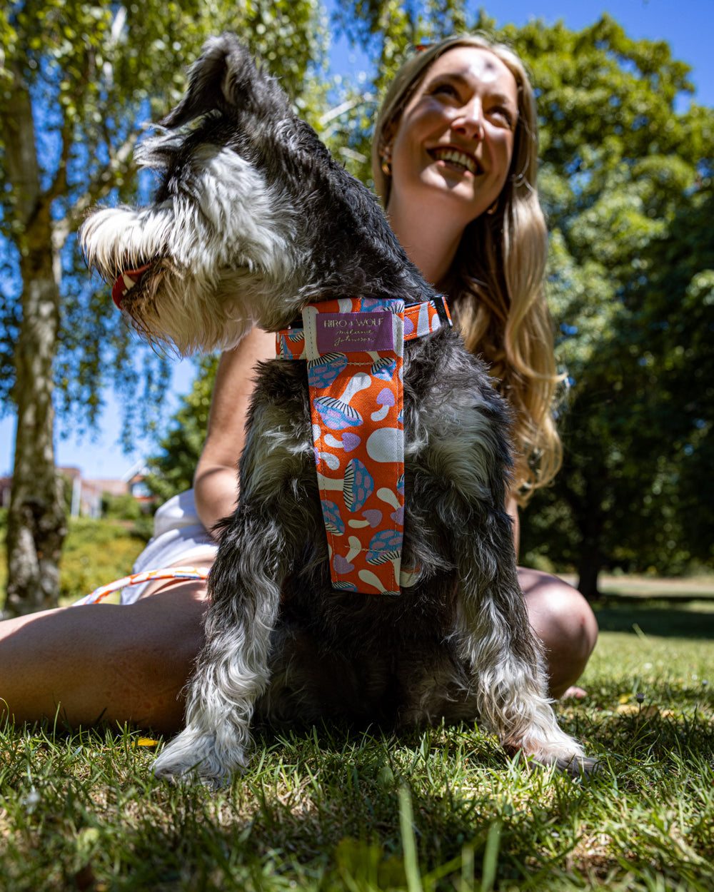 ABOUT THE PRINT: Designed by local illustrator Mélanie Johnsson, this enchanting print features a bold orange background, adorned with whimsical mushrooms. Inspired by the magic of the outdoors, this print is sure to delight human and hound alike. Perfect for every fun-guy out there!